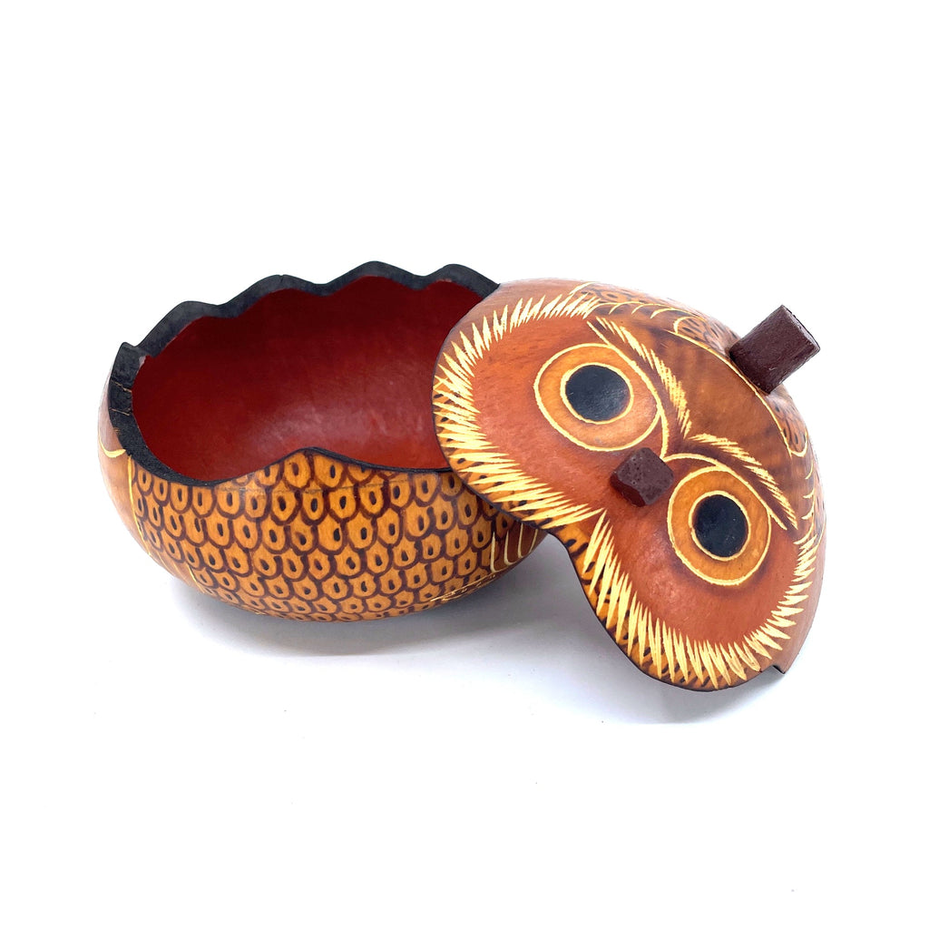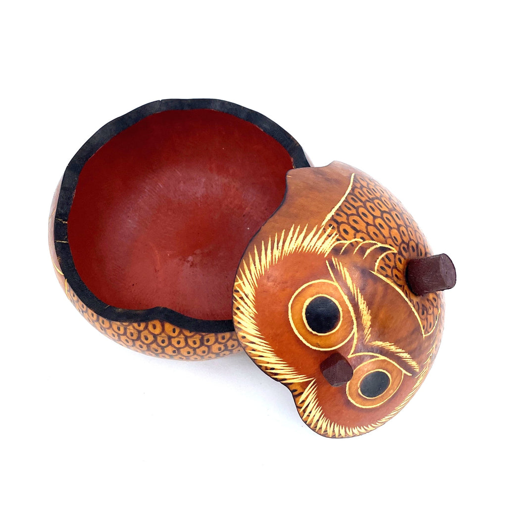Wise and distinguished, this little owl gourd box will happily perch on your dresser or nightstand, guarding any tiny trinkets he can hold! Perhaps he can be used as a little gift box to proudly present a gift to a special someone. Designed and hand-crafted by artists in Peru, our gourd boxes bring a modern flair to a 4,000-year-old traditional carving and burning technique.