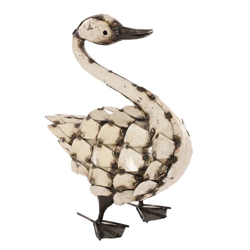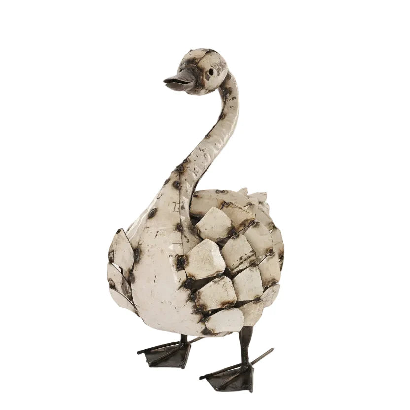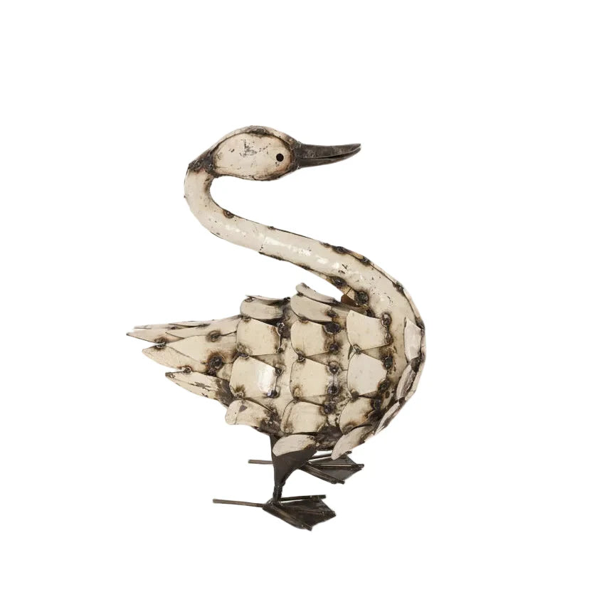 Escultores metalúrgicos zimbabuenses crean estas encantadoras esculturas de cisnes con metal reciclado. La pátina rústica y los detalles de soldadura visibles realzan la personalidad de los materiales recuperados. Un guiño a la sostenibilidad y la artesanía experta, esta pieza única de arte africano moderno con residuos es una adición inesperada a jardines exteriores o decoración de interiores. Cada escultura está recubierta con un barniz protector para resistir las inclemencias del tiempo.