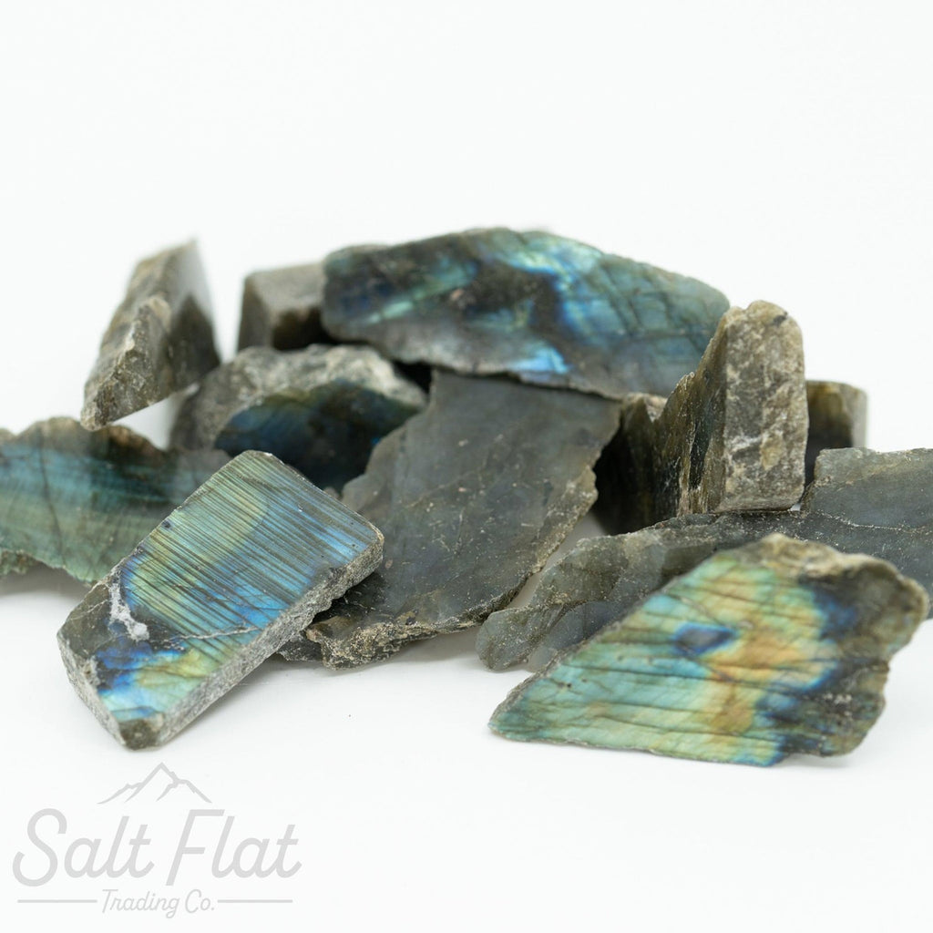 Labradorite is a mixture of two chemically related but slightly different feldspars: albite containing sodium and anorthite containing calcium. Alternating layers of albite and anorthite start to develop as labradorite cools. Light can reflect off and between them, producing an iridescent play of color.