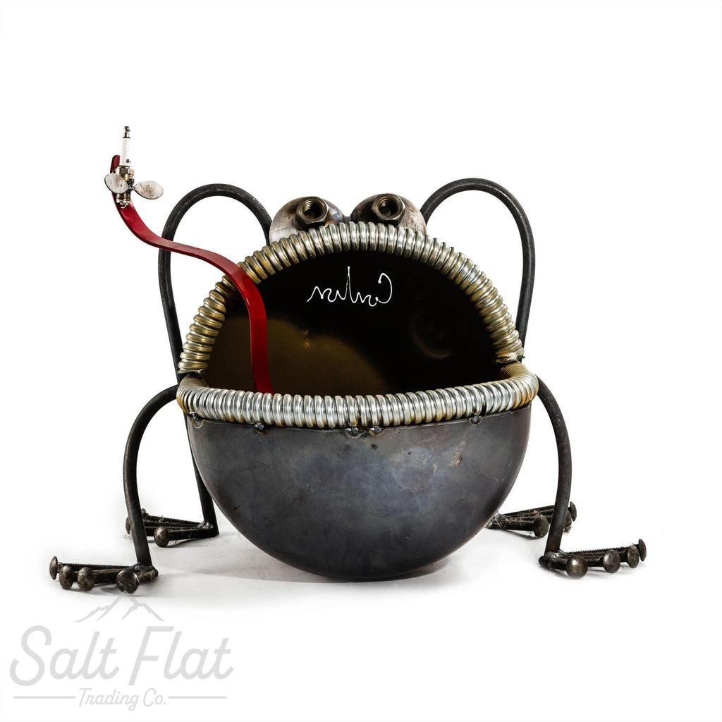 Add a touch of adventure to your yard with the Large Frog with Plug Bug! Made from scrap steel components, this bold statement piece features a bright red tongue and a magnetic plug bug. Unleash your wild side and show off your unique style with this quirky and fun addition to your outdoor space.