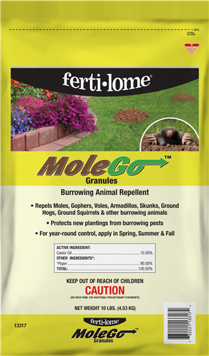 Se puede usar en otras áreas como césped ornamental, campos de golf y campos deportivos. Repele topos, tuzas, armadillos, marmotas y otros animales excavadores de su césped. Aplique inmediatamente después de detectar la presencia de topos o a principios de primavera, mediados de verano y principios de otoño.