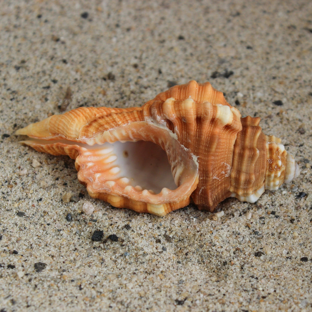Commonly known as Triton's trumpet this shell is home to very large sea snails in the Charonia genus. Adult tritons feed on starfish, jellyfish, and other mollusks and can reach lengths of up to 20 inches.