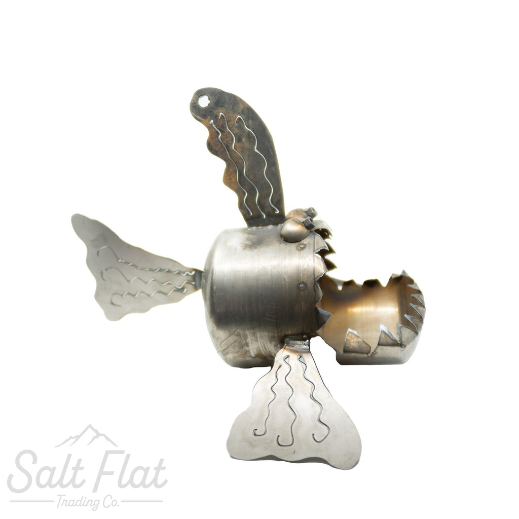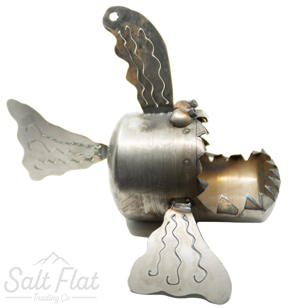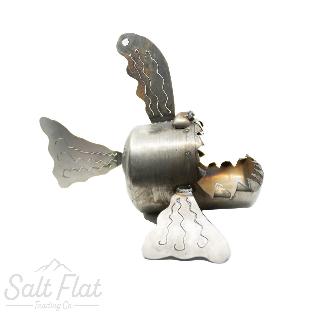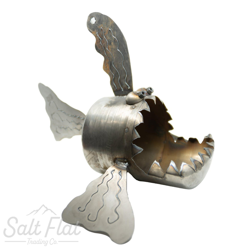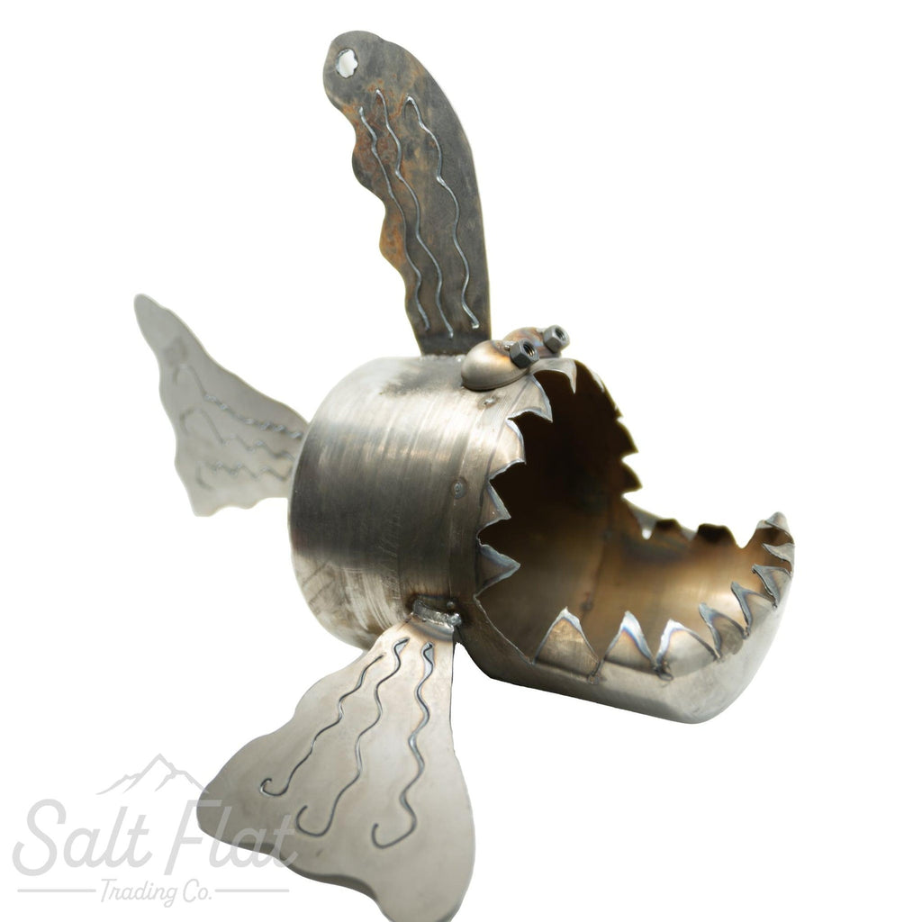 Fish made from scrap steel components. Perfect to sit in your garden or on your deck or turn him into a planter full of your favorite flowers. (And yes, we know how to spell teeth.)