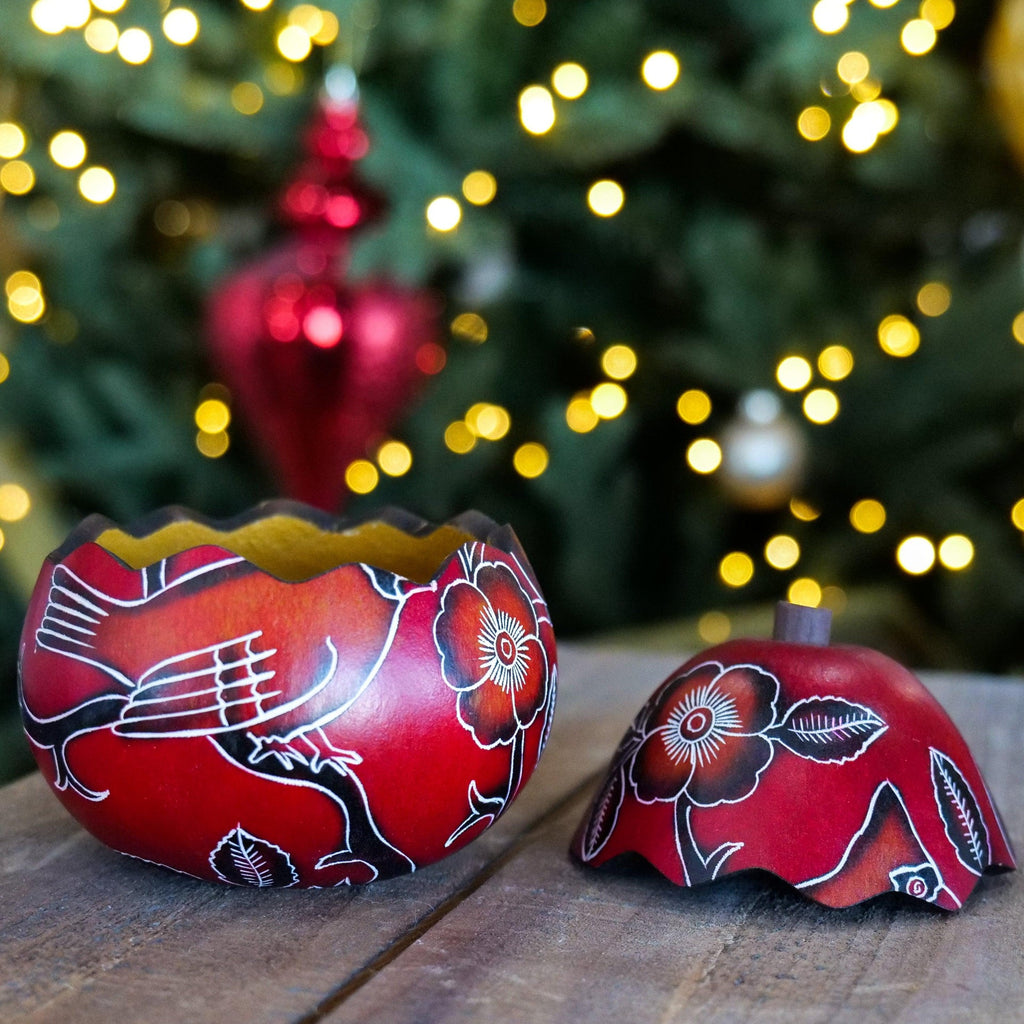 Bring some color into your household during the drab, cold winter. These cardinal-themed, carved gourd boxes will draw warm tones and fun to any room in the house and can even hold tiny treasures like jewelry. Designed and hand-crafted by artists in Peru, our gourd boxes bring a modern flair to a 4,000-year-old traditional carving and burning technique.