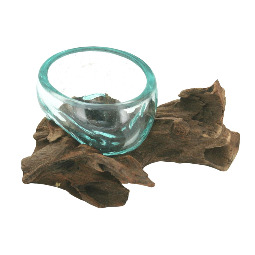 Handmade in Indonesia, our Driftwood Single Bowl Blown Glass pieces are unique and striking, with a burnished wood underneath. Each one measures approximately 4x4x2.5" H overall and 3x2" (8x5cm) for the glass. Due to the craftsmanship, minor imperfections and variations in size and design are expected. Grab yours now for a truly daring decor piece!