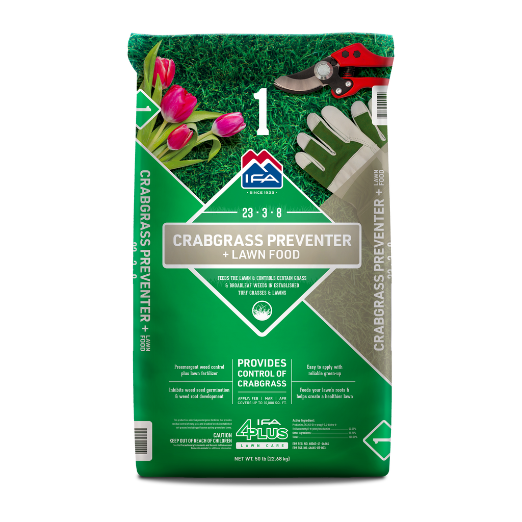 IFA Crabgrass Preventer + Lawn Food is Step 1 of the IFA 4Plus Lawn Care Program. This pre-emergent fertilizer gives your turf a strong start for months of thick, emerald grass that will leave your neighbors green with envy. This early-spring 23-3-8 lawn fertilizer combines key nutrients with pre-emergent herbicide. Nitrogen promotes fast green-up, while added iron helps grass develop the energy-producing green chlorophyll it needs after being dormant over the winter. Phosphorus supports strong root growth, potassium helps your grassy turf resist drought and disease, while the preemergence herbicide prevents early turf-invaders like crabgrass, spurge and other grassy weeds. And unlike other fertilizers, IFA’s Crabgrass Preventer + Lawn Food is locally-formulated specifically for the soil and seasonal conditions of the intermountain west area.